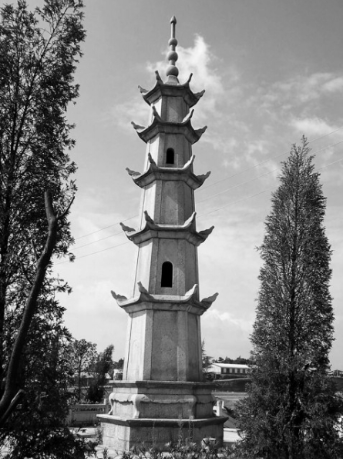 开福区植基塔,植基塔为花岗石结构,六边形,五层,各层出檐、檐角上翘,顶部以宝瓶作饰,具有典型的清代石塔风格。
