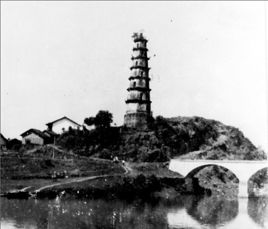 浏阳龙伏镇培文塔,是清代盛行的文峰塔,塔造型古雅美观,而且重檐檐角飞翘,在湖南现存古塔中少见。塔下河水涟漪,拱桥如虹,山峦塔身倒影,相映成趣。该塔被列为浏阳市文物保护单位,1998年倒塌。