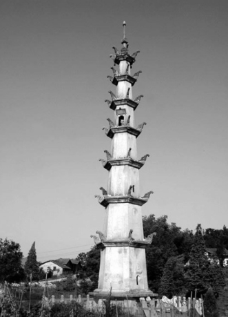 长沙县飘峰惜字塔,飘峰塔建于清光绪元年(1875),高25米,塔尖重两百公斤,相传为当地武举缪某用肩头扛上去安放的,人以为奇者。