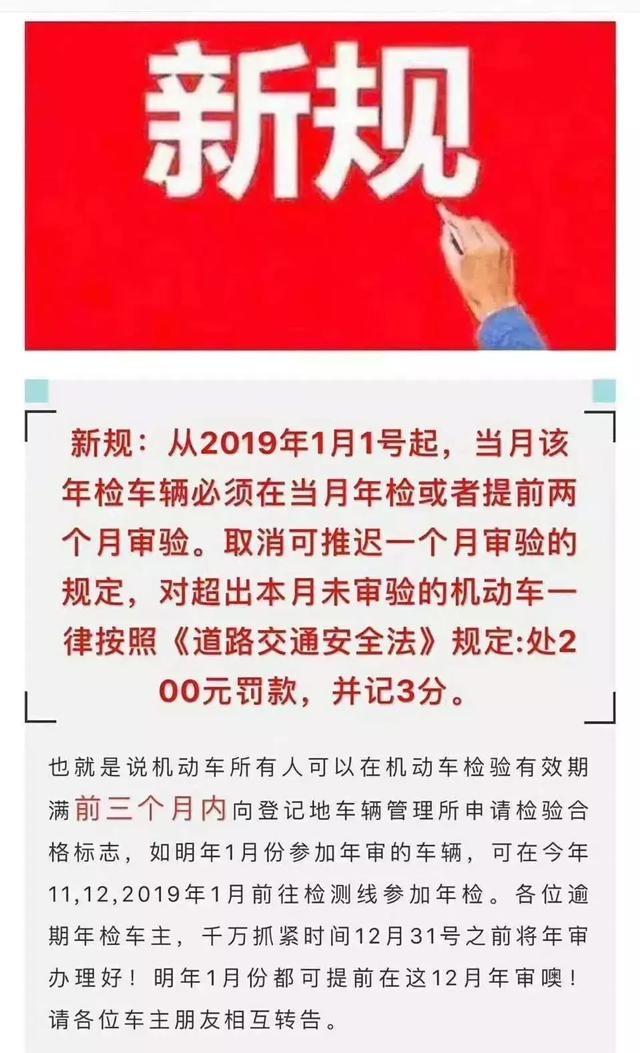 华声在线1月2日讯(新湖南客户端·华声在线记者 王为薇 通讯员 杨哲)近日,有一则消息传遍朋友圈以及各种微信群、QQ群,称2019年1月1日当月年检车辆必须在当月年检或者提前两个月审验,取消可推迟一个月审验的规定,否则处200元罚款,并记3分。这条消息貌似有板有眼,其实,这是一条假消息。今天,长沙市公安局交警支队权威辟谣。