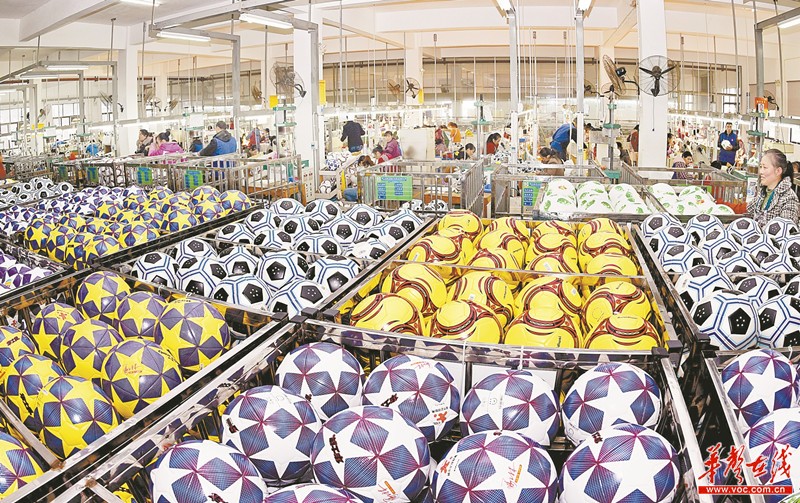 2月27日,洞口县经济开发区昌冠隆体育有限公司生产车间,员工在生产足球。该园区内拥有规模工业企业61家,以农副产品加工、电子信息、机械装备、体育器材等生产为主,解决了15360名农村剩余劳动力就业。目前,园区内企业复工率100%,呈现产销两旺的好势头。