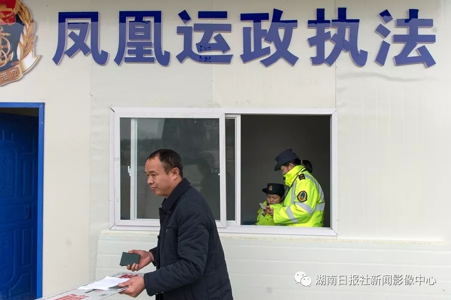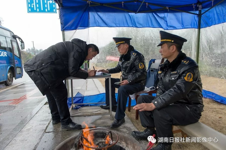 2月21日,凤凰县春运交通安全检查服务站里,执法人员冒着严寒为春运司乘人员和旅客保驾护航。