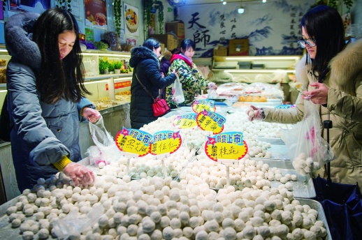 2月18日,长沙市开福区蔡锷北路一食品店,市民在选购手工元宵。元宵节前夕,长沙不少商家推出了现场制作、口味众多的传统手工元宵,受到消费者青睐。 傅聪 摄