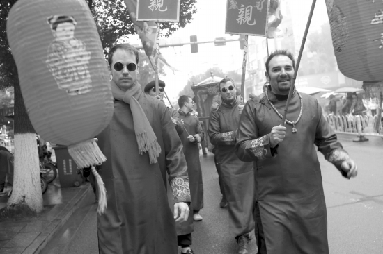 2月15日,衡东县城街头,老外组成的伴郎团,以中式婚礼迎娶新娘。组图/受访者提供