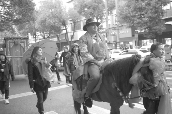 2月15日早上8点,衡东县城街头。一位洋女婿穿着新郎礼服、骑着大马、戴着大红花,喜气洋洋。7名老外组成的伴郎团,举着“迎亲”牌、提着喜灯、抬着花轿,式样十足。他们要迎娶一位衡阳姑娘。