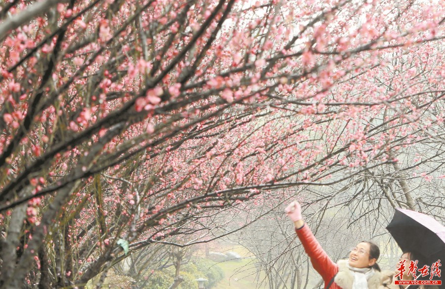 图②2月17日,游客冒雨在衡阳市雁峰区南湖公园欣赏梅花。近日,该公园内的梅花在春雨中灿烂盛开,分外娇艳,吸引众多游客来此赏梅探春。郑潮平 摄
