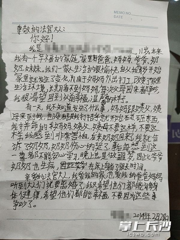 长沙晚报掌上长沙3月1日讯(全媒体记者 朱炎皇 通讯员 周驰宇)“亲爱的法官大人,我爱我的家,也爱我的爸爸妈妈,听到大人们说要离婚,我只希望他们能够身体健康,希望他们都能幸福,不要因为这些事争吵了。”今日,记者从宁乡市人民法院了解到,这一封情真意切的信来自于一位11岁的孩子,他写给审理他父母离婚案的法官,渴望“回到以前幸福、温馨的样子。”