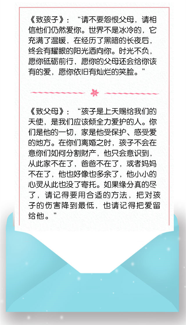 《致父母》:“孩子是上天赐给我们的天使,是我们应该倾全力爱护的人。你们是他的一切,家是他受保护、感受爱的地方。在你们离婚之时,孩子不会在意你们如何分割财产,他只会意识到,从此家不在了,爸爸不在了,或者妈妈不在了,他也好像也多余了,他小小的心灵从此也没了寄托。如果缘分真的尽了,请记得要用合适的方法,把对孩子的伤害降到最低,也请记得把爱留给他。”