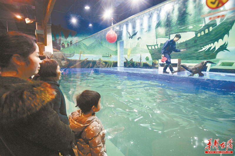 2月26日,娄底市海立方海洋公园,市民在看海狮表演。该公园总建筑面积8000平方米,含2大剧场、18大体验项目和108项课程,是一家集海洋生物观赏、海洋剧场表演、亲子娱乐互动、海洋职业体验等于一体的全业态整合体验型海洋馆。