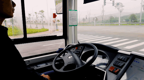 (自动驾驶的公交车正在自动转弯)