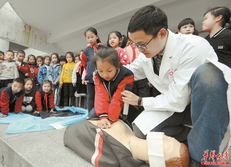 4月22日,靖州苗族侗族自治县土桥小学,志愿者指导学生学习“心肺复苏”按压方法。当天,该县志愿者协会联合“心唤醒”基金举办“急救知识进校园”活动,通过自救、互救知识学习,急救技能演练等形式,提高师生自救能力,增强安全意识。