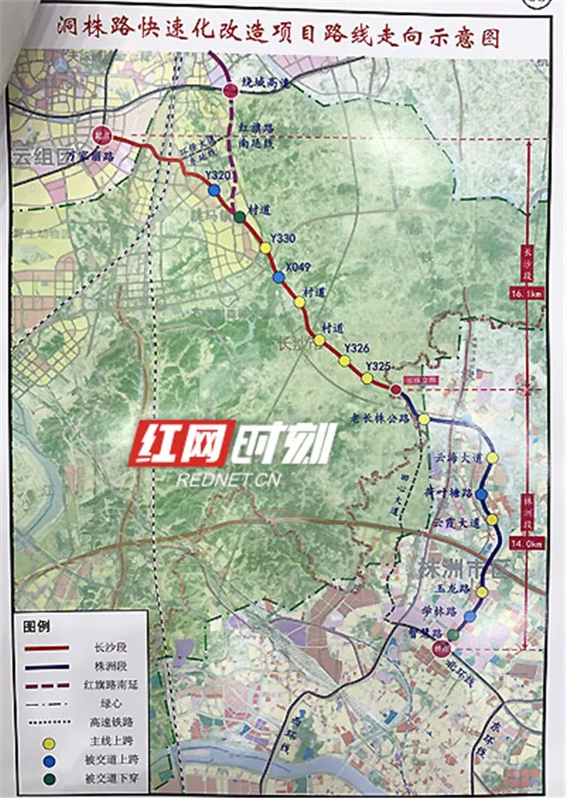 洞株路快速化改造,项目起于长沙市万家丽路与环保大道交叉口,止于株洲市北环线交叉口,全长30.1公里。改造完成后,共消除22个灯控路、6个无信控路口的影响,通行时间预计由原来的45分钟减少为28分钟。