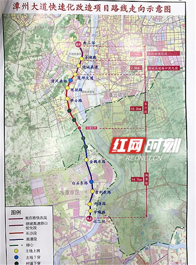潭州大道快速化改造,项目起于长沙市西二环罗家嘴立交,止于湘潭市北二环交叉口,全长30.2公里。改造完成后,共消除31个灯控路、22个无信控路口的影响,通行时间预计由原来的48分钟减少为23分钟。