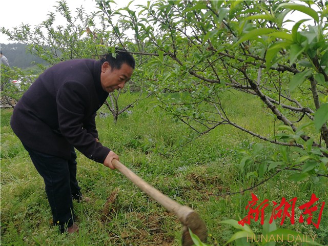 (楚东村贫困户罗永根正在自家果园里忙着除草、施肥)