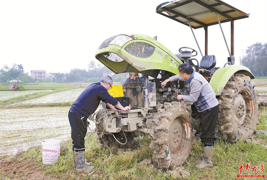 4月12日,洞囗县花古街道七里村,农机技术员在帮农民义务修理耕田机。春耕生产开始后,由该县农机部门28名党员组成的农机春耕服务队深入到田间地头,义务为农民检修春耕农用机械,帮助解决农机操作中遇到的技术难题,传授维修技术。