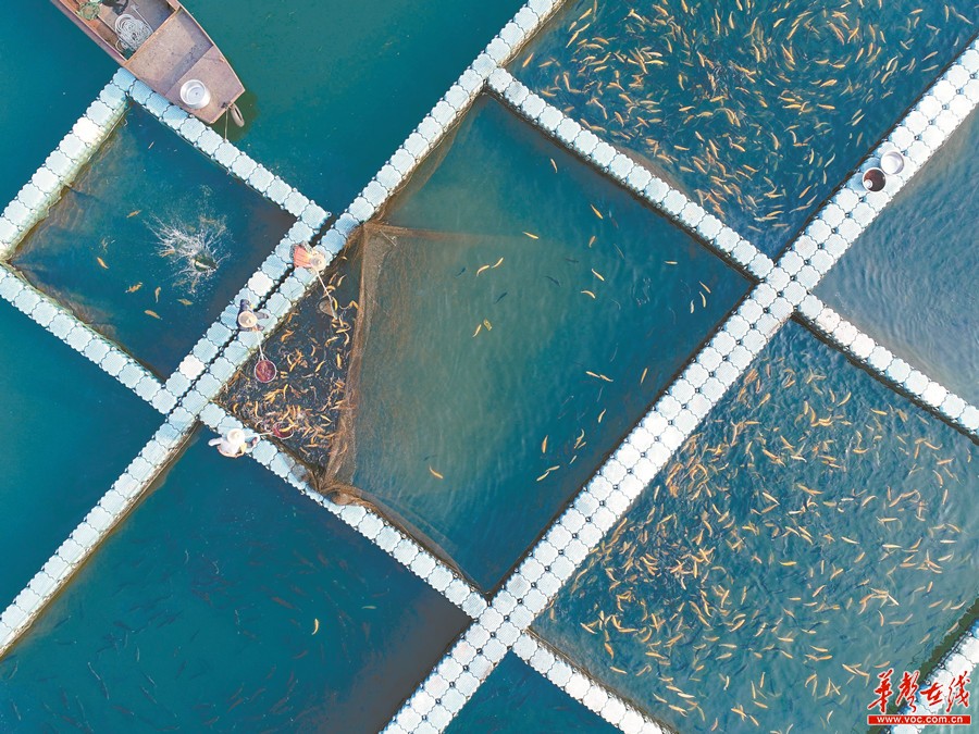 4月9日,资兴市东江湖下游的东江湾水域,渔民在冷水鱼养殖场喂鱼。近年,该市依托东江湖旅游业的发展,在保护好水资源的前提下适度发展名贵冷水鱼养殖产业,带动了当地群众增收致富。目前,资兴市已成为湖南最大的名贵鱼生产基地。