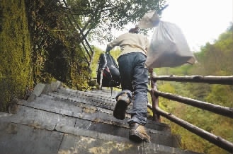 3月27日,谢红军挑着从镇上买的物品回家。红军村在半山腰,还没有通公路。