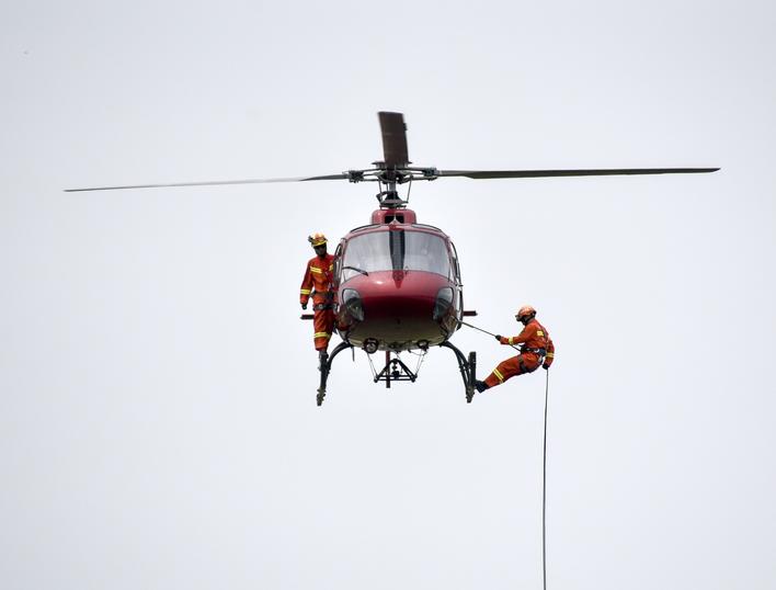 揭牌仪式后,航空救援大队演练启动。地面一名“伤员”需要紧急转移,救援直升机很快赶到现场并悬停在空中,救援人员随即从机舱内放下绳索,速降至地面。在对“伤员”简单包扎后,救援人员与“伤员”通过绳索返回机舱。随后,队员们还开展了高空吊桶灭火救援、高空索降营救高层建筑被困人员、水域救援舟与救援直升机协同救援等科目演练。