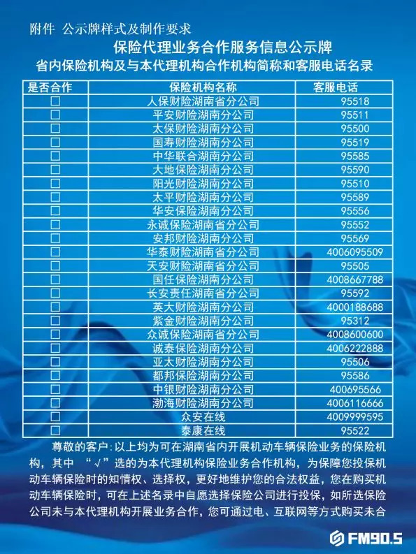 此外,各车商类保险代理机构要按要求在公示牌列示财产保险公司名称和客服电话信息,全省辖内现有财产保险公司省级分公司相关信息。后续如果增加新设财产保险公司,各车商类保险代理机构可通过登录中国银保监会湖南保监局官方网站取得新成立财产保险公司信息,及时更新公示牌内容,确保营业大厅公示信息及时、完整和准确。
