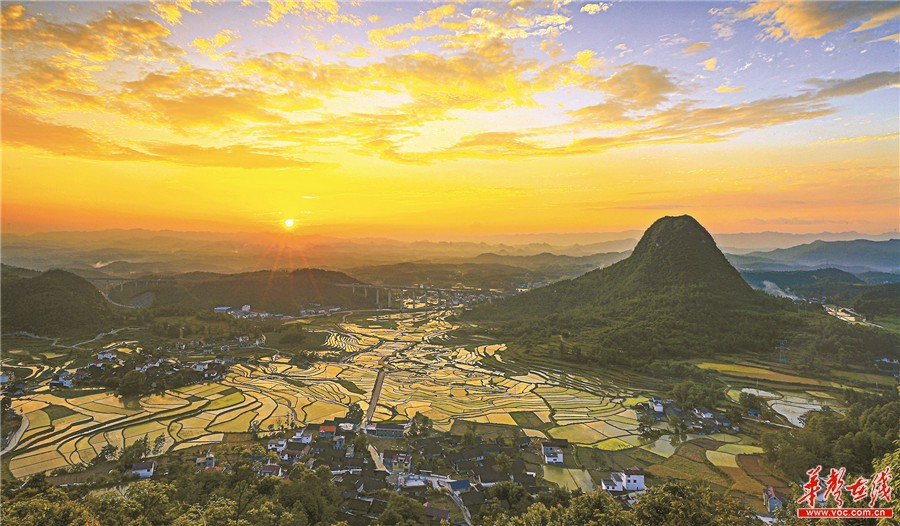 5月27日傍晚,花垣县麻栗场镇沙科村,晚霞中,蜿蜒的道路,如镜的水田,连绵的青山和错落有致的苗寨相互映衬,构成一幅绚丽多彩的田园画卷。龙艾青 摄