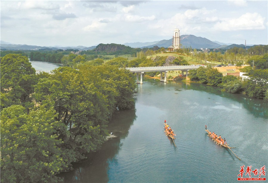 5月26日,道县洑水河梅花贵头段,村民在河面上划龙舟。近年,道县坚持以生态立县,实施退耕还林、封山育林、水土保持、矿山植被修复等生态工程,不断扩大森林面积,提高水源涵养能力,全县生态持续向好,呈现出“河清、岸绿、景美”的生态景观。蒋克青 雷伙生 摄影报道
