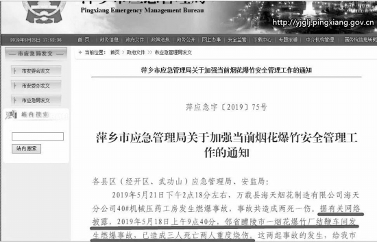 随后,记者在名为“中国烟花爆竹网”的公众号上查询到了此篇发文。这是5月24日萍乡市应急管理局发布的《萍乡市应急管理局关于当前烟花爆竹安全管理工作的通知》(萍应急字〔2019〕75号)。