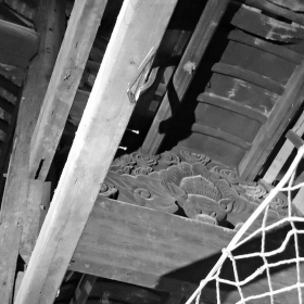 躲开熙熙攘攘的人群,独自在庙周围观察。这是一座看起来并不怎么出众的古建。青砖灰瓦硬山顶建筑,在湖南古建中极为常见,建筑内部为中国传统建筑常见的穿斗式构架,柱础无纹饰,构架间无斗拱,连藻井也并无纹饰,庙顶开有两个老虎窗,这似乎并不太符合庙宇类古建的风格,应是后人在此居住时为了通风自行开设。在湖南众多的庙宇建筑中可以说是比较简陋的一座。