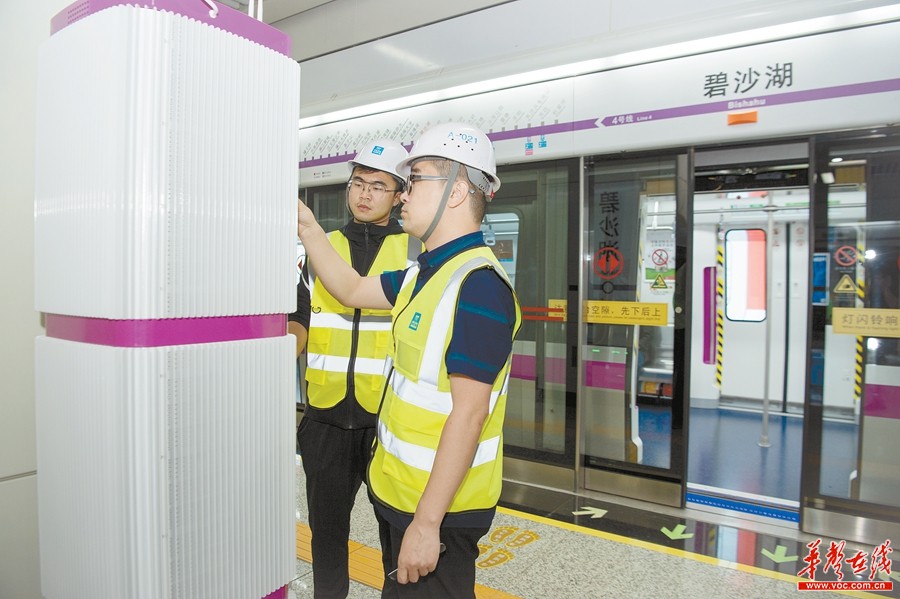 5月20日,长沙地铁4号线碧沙湖站,中建五局三公司的工程师在检测空气净化器。地铁4号线一期工程将于26日载客试运营。近日,该公司工作人员对各站内的空调系统、消防设施等设备进行最后一轮调试检修,以确保设备运行万无一失,为市民提供安全舒适的乘车环境。