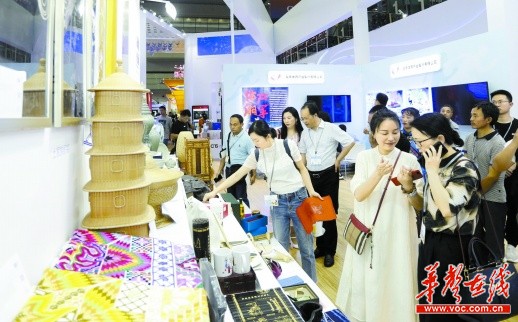 来自十八洞村的苗绣手提包、素纱单衣咖啡杯、女书扇子、竹编台灯……古老湖湘文化与现代人喜好紧密结合的文创产品男女老少都喜欢,不少人购买了自己心仪的产品。