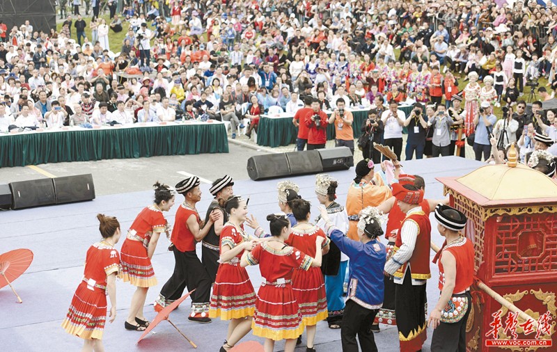 5月12日,身着苗族服装的姑娘们在表演《苗家婚俗》。当天,“神奇绿洲 醉美绥宁”2019年邵阳绥宁苗族“四月八姑娘节”开幕式在绥宁县黄桑生态旅游区举行。活动期间,将举行“醉美姑娘”帐篷民宿节、第三届湘西南土货节暨“扶贫花开”文旅创意产品展等活动,全方位展示绥宁苗族文化和旅游资源的独特魅力。