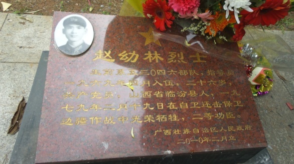 接着,我和副连长抬着另一个花圈来到赵幼林烈士的墓前。花圈的缎带上右边写着“献给幼林”,左边写着“爸爸力宽暨全家”。这是广州军区后勤部赵力宽政委委托我们献给他儿子赵幼林的。赵幼林烈士生前系41军122师364团1营1连指导员。战前,他对前来部队检查战备工作的父亲表示:请爸爸放心,一定不辜负您的期望,奋勇杀敌,为父母亲、为人民军队争光!2月17日,自卫还击作战打响,他带领连队担负正面攻击任务,身先士卒,向敌猛攻,为后续部队赢得战机,荣立二等功;2月19日,在朔江战役攻打南山的战斗中,他在率领战士突破敌人炮火封锁的开阔地时,不幸中弹,英勇牺牲,年仅26岁!