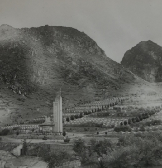 队伍到了墓地。墓地在县城的东面,建在一座高高的山坡上,座北朝南,山坡平展舒缓,背后是峰峦叠嶂的群山。由于时间仓促。墓地还未完全修好,前面的几排坟墓刚做好水磨石面,后面的还是一排排鲜净的黄土垅;石质的墓碑还未搞好,每座墓前都插着一块写着烈士姓名、籍贯、职务、入伍年月及牺牲时间的木牌。一千零二十一位烈士就长眠在这里,静静地躺在祖国母亲坚实宽厚的怀抱里。一排排竖在墓前的木牌,仿佛列阵排队的士兵,在时刻准备听从祖国的召唤!