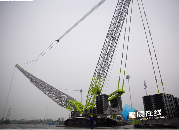 (2019中国(长沙)国际工程机械展展品之一,中联重科风电吊装“新王者”ZCC9800W通过4天的组装,于5月5日顺利实现起臂。展会组委会 供图。)