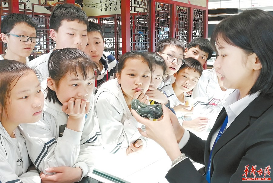 5月8日,临武县宝玉石文化产业园,工作人员向前来参观的学生介绍香花玉的特征。当天,该县开展“爱家乡 爱矿博”主题社会活动,各学校纷纷组织学生把“产业园”作为第二课堂,近距离接触和体验家乡宝玉石文化。