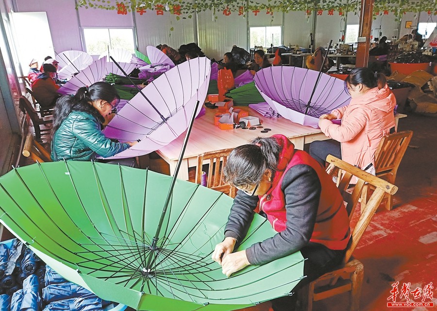 5月7日,凤凰县千工坪镇胜花村扶贫车间,工人在加工雨伞。去年来,千工坪镇引进雨伞加工企业,在胜花村兴建扶贫车间,采取“内销+订单出口”模式销售,吸纳20余名贫困劳动力就业,让他们既能照顾家人又能实现劳务增收。滕建康 摄