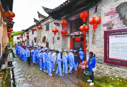 4月11日上午,来自郴州市的中学生在沙洲村参观学习。