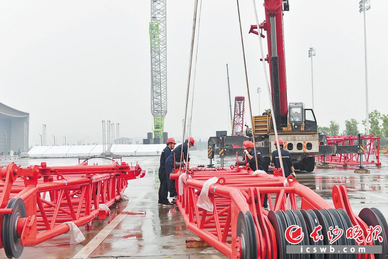 长沙国际会展中心,参加2019中国(长沙)国际工程机械展览会的企业工作人员正紧张布展。 长沙晚报全媒体记者 王志伟 摄