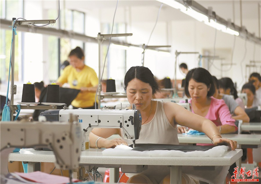 6月26日,通道侗族自治县双江镇塘冲村制衣厂扶贫车间,村民在生产订单产品。今年来,该县通过内引外联、政策扶持等方式,引导企业创办以制衣、种植养殖、农产品加工等类型为主的城镇式、厂房式、居家式、合作社式“扶贫车间”,带动了近千名贫困群众在家门口就业增收。