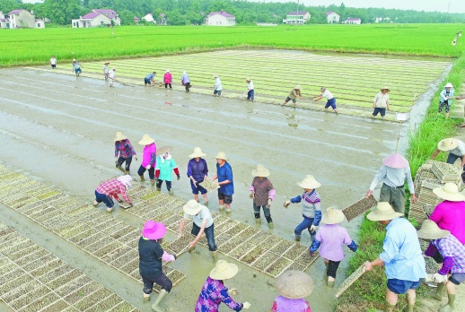 6月19日,益阳市赫山区笔架山乡中塘村,农民趁着晴好天气铺排晚稻秧盘。近年,该区通过扶持种粮大户、家庭农场、专业合作组织等新型农业经营主体,促进粮食生产标准化,全区今年种植早稻、一季晚稻、双季晚稻面积共达110余万亩,成为全国重要商品粮生产基地。
