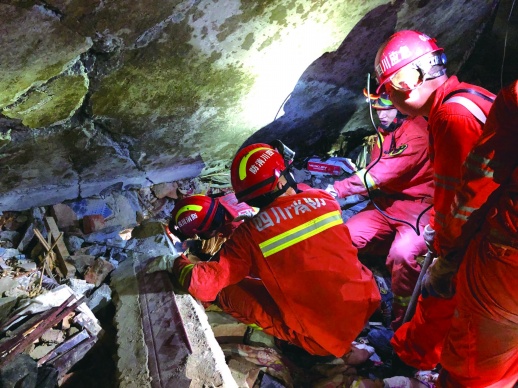 6月18日凌晨,救援人员在长宁县双河镇搜救。 新华社 图