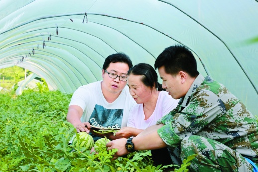 6月14日,保靖县复兴镇河边村,农技员、驻村扶贫工作队员在指导瓜农杨再友(中)给西瓜授粉。今年雨水天气偏多,对西瓜的品质和产量带来不利影响。近段时间,该村驻村扶贫工作队邀请农技人员及时为瓜农提供技术指导,帮助他们增产增收。