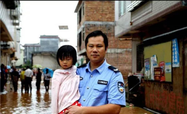 视频记录下这动人的一幕,三名警察赤膊上阵,合力向前推着小车,洪水漫过了他们腿部大半部分,在湍急的水流中,他们牢牢护住载着孩子的车,慢慢向前推移。