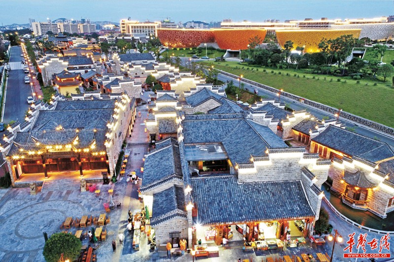 6月5日傍晚,绚丽的灯饰将醴陵瓷器口风情文化古街装扮得格外辉煌耀眼。该古街建设了明清古建筑群、仿古龙窑、陶艺学堂等建筑,总长约700米,是省内首创的集陶瓷文化、建筑文化与民俗风情于一体的文旅古街。