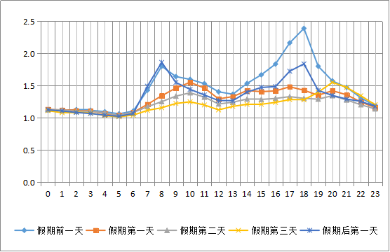 统计分析了近三年端午节三天假日的前两天的城区道路拥堵指数变化,节假日早晚高峰不明显,整体拥堵指数位于1.7以下,为非拥堵状态或畅通状态,呈现“无高峰”特征。如图3所示。