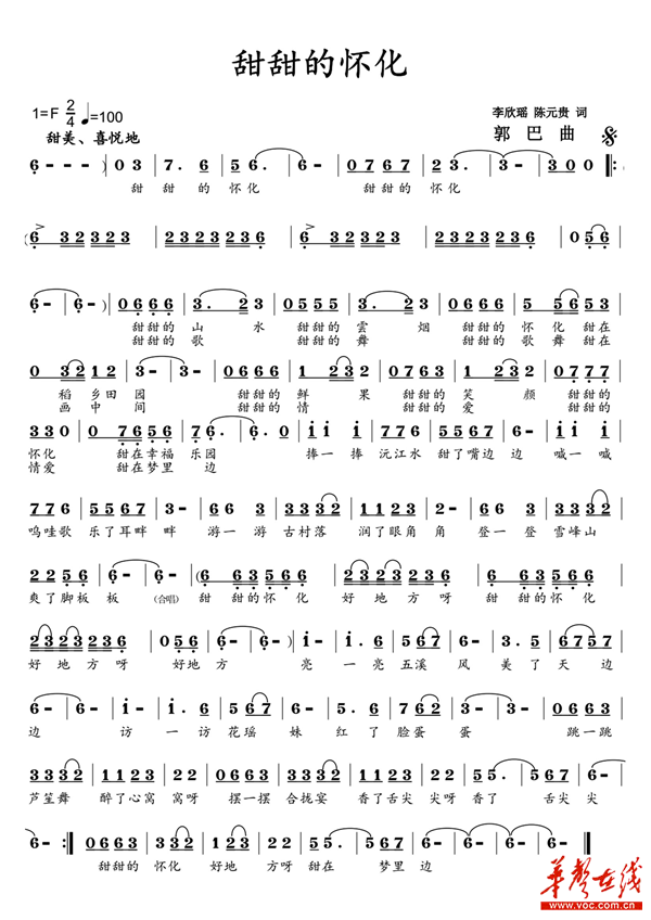 登一登雪峰山,捧一捧沅江水;游一游五溪风,访一访花瑶妹;摆上合拢宴,跳起芦笙舞,一首比蜜还甜的歌曲带您走进甜甜的怀化……作品融合怀化的山水景观、人文风情,酿造出一首比蜜还甜的歌谣。歌曲曲调轻快,意境甜美,别致新颖,是一首亲切欢畅、雅俗共赏的宣传推介怀化好地方的原创歌曲。