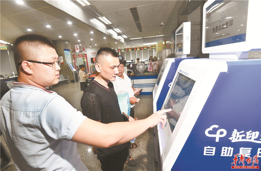 7月16日,长沙市人力资源和社会保障局政务中心,工作人员(左一)在指导市民进行自助复印操作。本月中旬开始,该中心撤销原人工复印窗口后添置3台新自助复印机,为群众提供免费快捷的复印打印服务。田超 郑云文 摄影报道