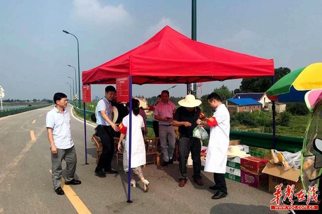 7月11日上午,记者在采访途中遇到望城区卫生健康局组织的医疗服务队的几位医生正在为湘江大堤值守点的工作人员赠送防暑物资。交谈中,得知几位医生早上9点就从丁字湾街道出发,沿湘江东岸为每一个值守点的工作人员送上精心熬制的防暑中药、夏桑菊颗粒、藿香正气液等药品,并询问防汛值守人员的身体情况,必要时给予治疗帮助。