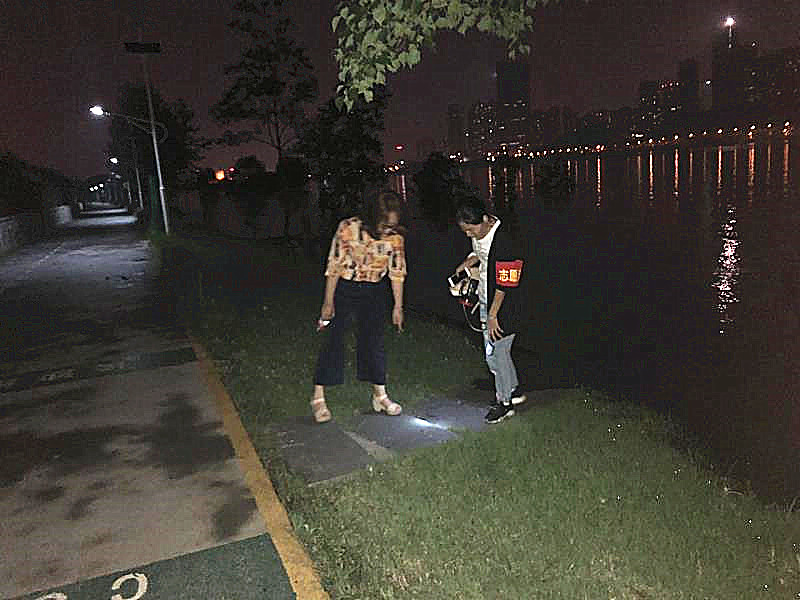 夜幕降临,刘乐融随着防汛志愿队伍来到了潇湘中路防汛点。夜色下,沿江步行道上到处都是一闪一闪的手电筒光。原来,这是一支由女同胞组成的志愿队,队员都是麓枫社区枫和艺术团的文艺爱好者,他们在微信群看到社区铺排防汛工作后,就自发申请加入巡堤队伍。