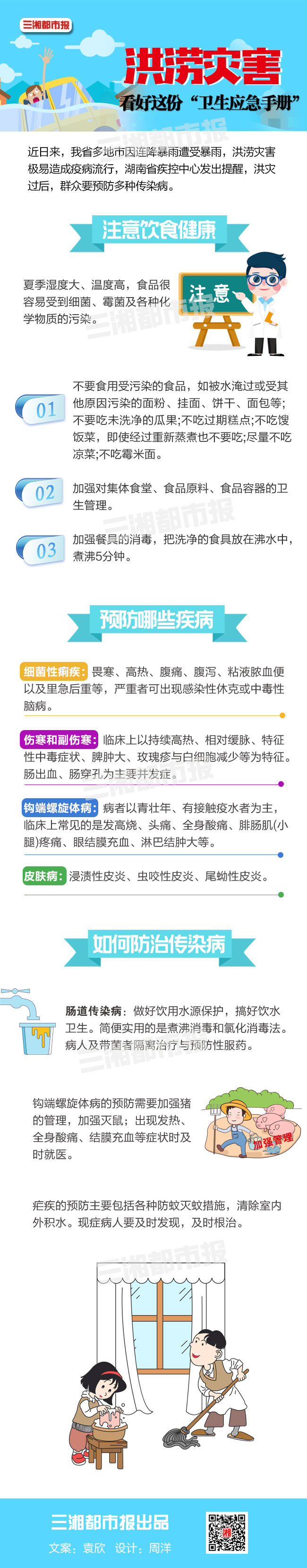 华声在线7月9日讯(三湘都市报·华声在线记者 李琪 通讯员 刘富强 实习生 严语)近日来,我省多地市因连降暴雨遭受洪涝灾害,给人民群众健康和生命财产安全造成严重影响。洪水灾害极易造成疫病流行,一些多年不发生或很少发生的疫病,一些在正常年份不会发生的疾病,由于洪水的缘故,亦有可能发生。目前虽然没有疫情发生。防病防疫是一项长期的工作。湖南省疾控中心今天发出提醒,洪灾期间,群众要预防多种传染病。
