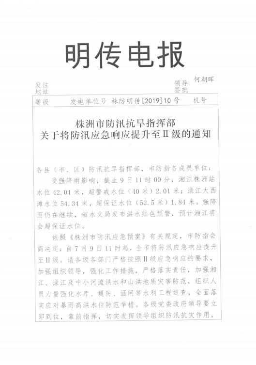 华声在线7月9日讯(湖南日报·华声在线记者 戴鹏)株洲市防汛抗旱指挥部自9日11时起,将全市防汛应急响应提升至Ⅱ级。